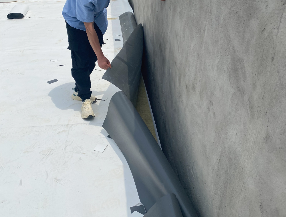 屋面平面周边与立面交接处PTO卷材用通长铁压条固定,立面钢制压条上口用塑料焊绳通长焊接,在平面与立面交接处用150mm宽通长PTO卷材覆盖、接缝与大面卷材焊接严密。根据设计和规范抗风揭要求,在屋面四周和年最大频率风向位置按要求裁取小于TPO幅宽的卷材,加密固定点以满足抗风揭要求。屋面上大于500mm*500mm的穿出构件,其周边应使用压条固定,立面钢制压条上口用塑料焊丝通长焊接,在平面与立面交接处用200mm宽通长PTO卷材覆盖、接缝与大面卷材焊接严密。优先使用阴阳角预制件,也可以采用均质TPO片材按图示形状裁剪,焊枪热熔。阴阳角处增铺卷材附加层,优先使用阴阳角预制件,也可以采用均质TPO片材按图示形状裁剪,焊枪热熔。