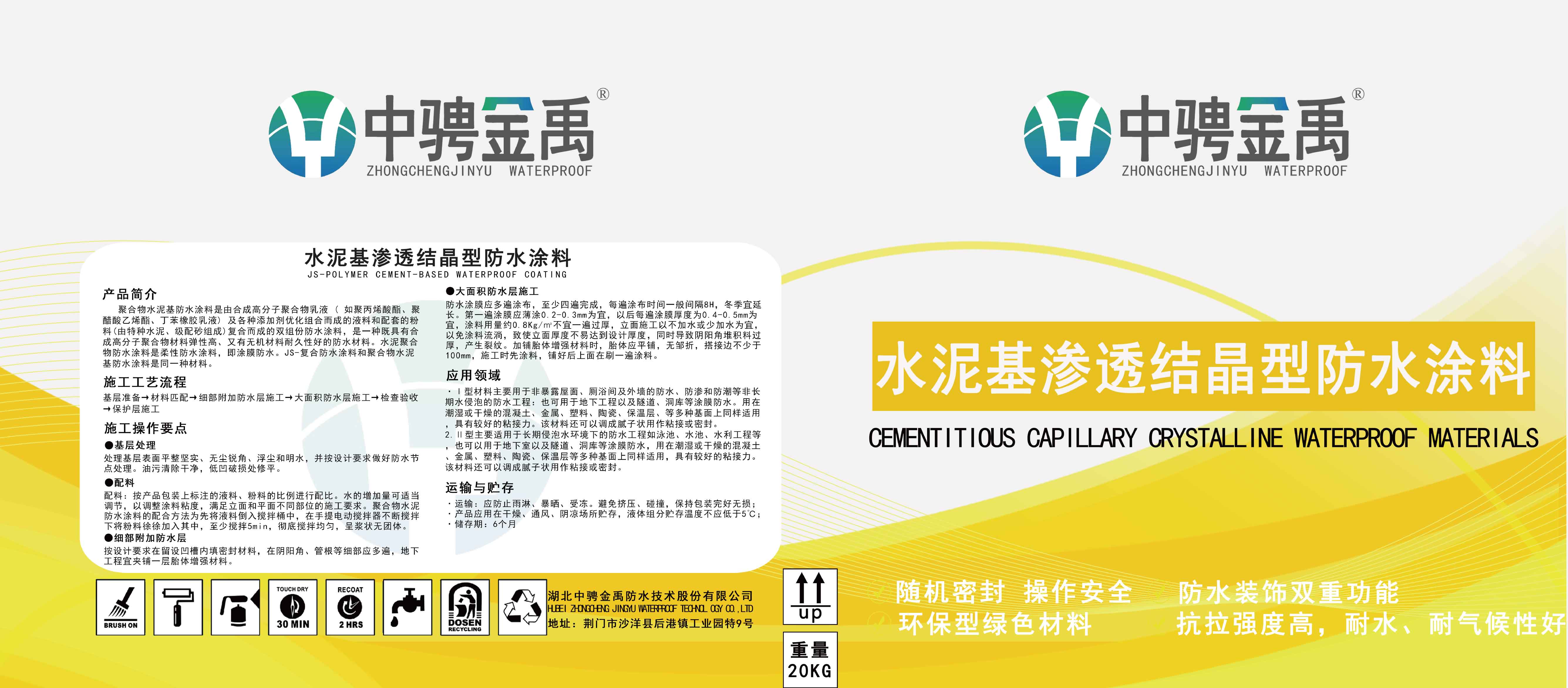 该产品是以普通硅酸盐水泥为基料,掺入活性化学成分配制而成的灰色粉状材料。在水的作用下,其中含有活性化学物质随水渗透到内部,并反应生成钙矾石等不溶性晶体,其活性化学物质与未水化的水泥颗粒发生水化反应, 并促进水泥水化,形成水泥水化晶体,生成大量晶体填充,封堵孔隙,使水无法进入混凝土,从而达到防水目的。